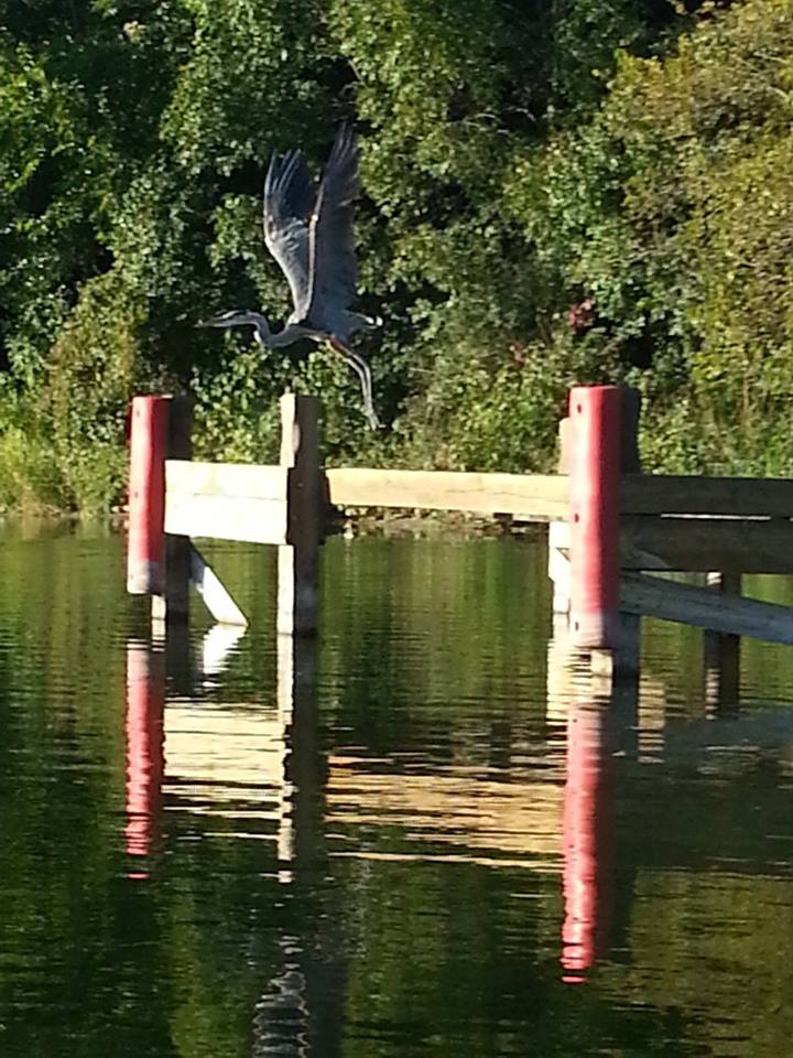 So, we kayaked around the lake, and I am keeping the name of the lake ANONYMOUS since I will die of embarrassment if my name is ever associated with this…and noticed four ducks and a heron or sandhill crane (I am not up on my birds) always ONE PIER ahead of us. My sister likes taking animal pictures (last week, we had to stalk some deer in the kayak), so she would attempt to get pictures of the ducks or large mystery bird at every pier. And they would ALWAYS fly away at the last second.