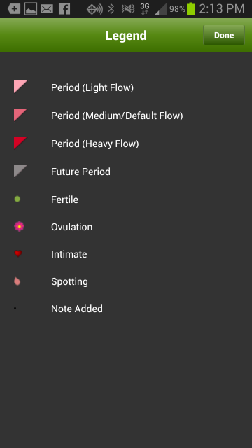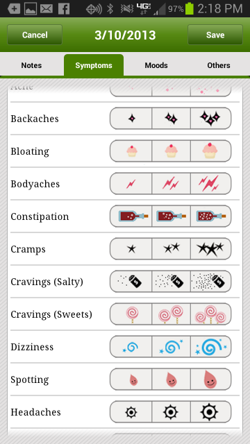 The next screen is kind of boring. I mean, my life is not so pathetic that I will track if I am spotting or the speed of my flow. Come on. Although, it could be fun to go to the gyno with such an abundance of info and open up the app and give WAAAAAAAAAAAAAAY more info than they need.